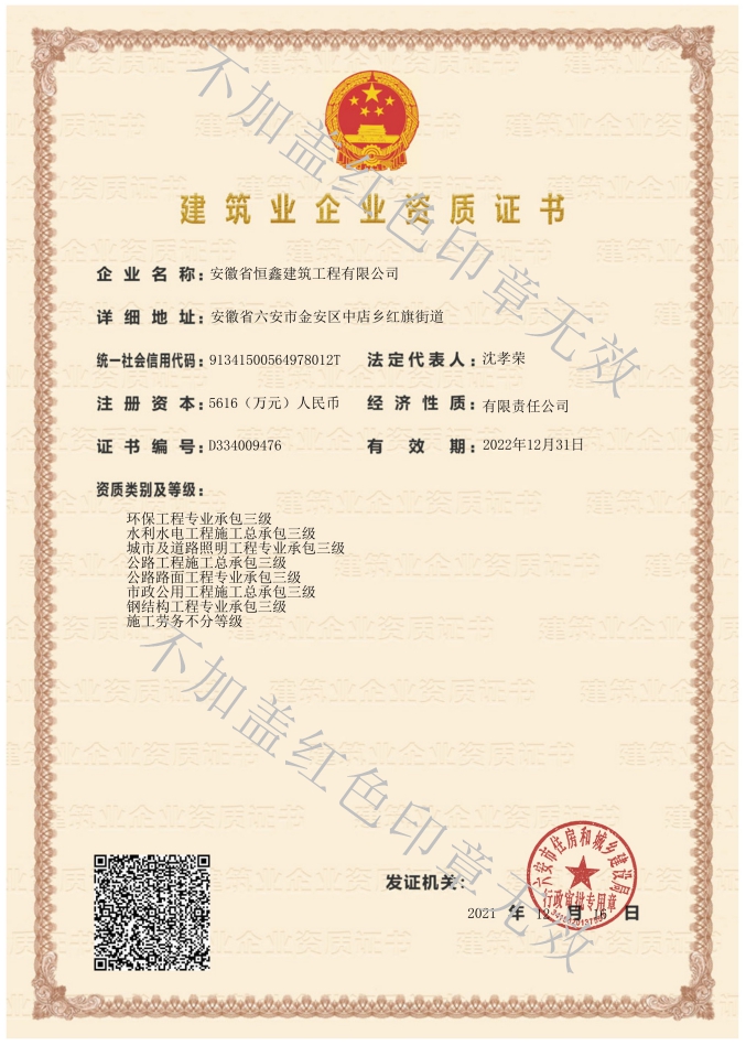 公司目前主要的資質(zhì)范圍:建筑工程施工總承包二級,市政公用工程總承包三級、水利水電工程施工總承包三級,公路工程施工總承包三級;建筑裝修裝飾工程專業(yè)承包二級,電子與智能化工程專業(yè)承包二級、建筑幕墻工程專業(yè)承包二級,城市及道路照明專業(yè)承包三級、鋼結(jié)構(gòu)工程專業(yè)承包三級,公路路面工程專用承包三級。